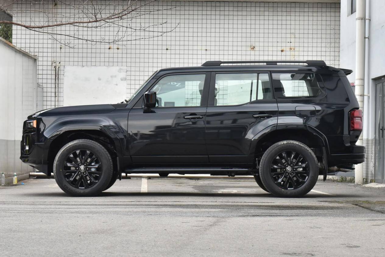 车身侧面延续“方盒子”造型设计,车顶平直,腰线从前大灯一直延伸到后尾灯,车窗水切线前低后高,带来更好的驾驶视野,前后轮拱多边形样式,配合塑料包围增加越野氛围。细节上,旗舰VX版配备20英寸熏黑锻造轮毂与高扁平比轮胎,具有不错的舒适性。车顶配有行李架可以满足长途穿越的装备需求。