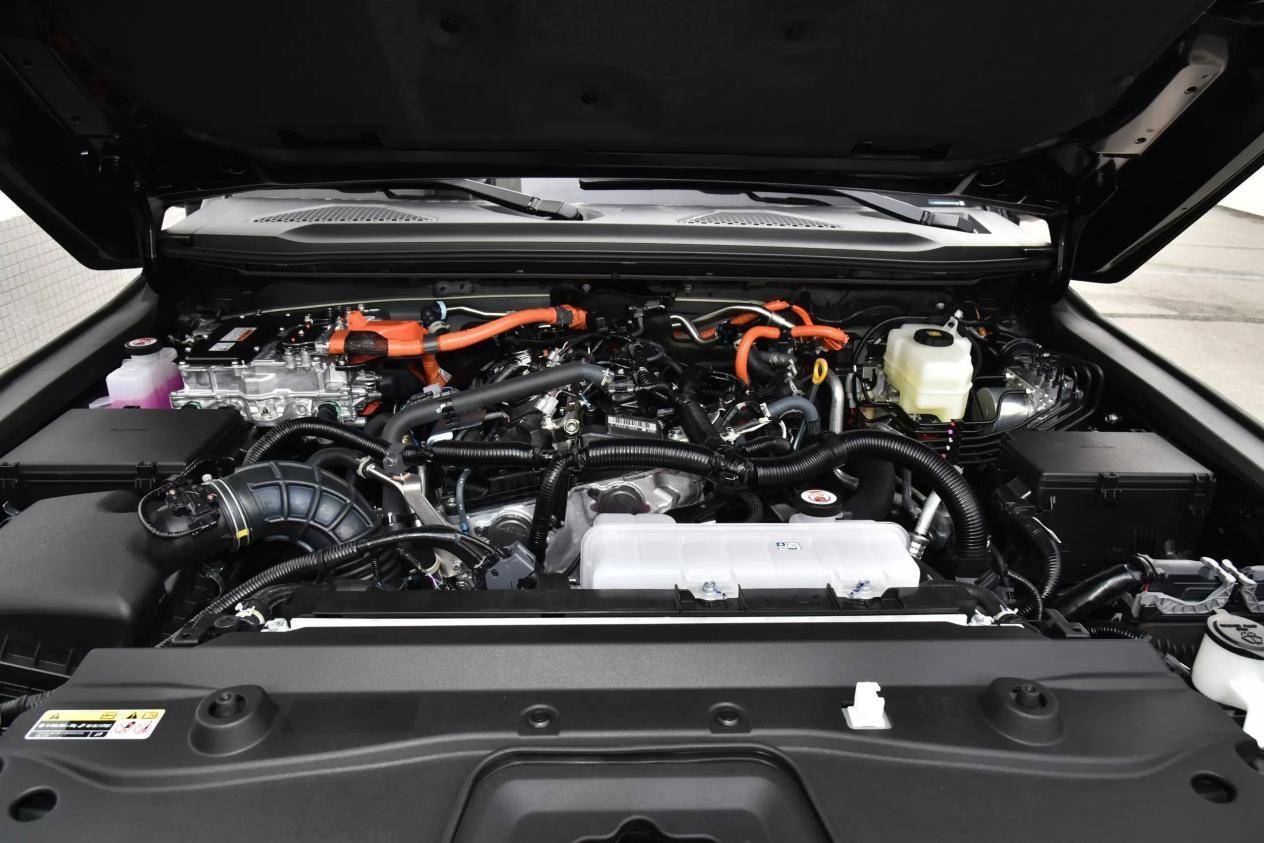 整套动力的综合功率为243千瓦,峰值扭矩630牛·米,从参数来看,比以前的六缸自吸可是要强悍多了。传动系统方面匹配的是8挡手自一体变速箱,配了一块5.1度电的镍氢电池,提供全时四驱系统,这套动力的最高时速170公里/小时,零百加速其实是跟之前的6缸车型差不多,实测在8秒多,不过燃油经济性有了明显提升,官方标定的WLTC工况综合油耗在10.11升/百公里,实测的百公里油耗在9L左右,跟一台2.0T的城市SUV差不多。这也导致在越野场景以及城市拥堵路况的行驶有了更好的能耗表现。