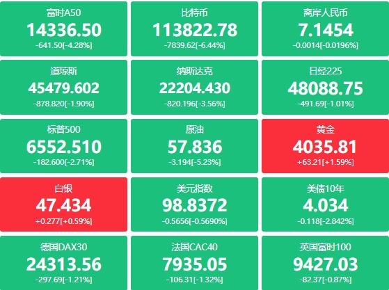 截至收盘,道指跌878.82点,跌幅为1.90%,报45479.60点;纳指跌820.20点,跌幅为3.56%,报22204.43点;标普500指数跌182.59点,跌幅为2.71%,报6552.52点。纳指、标普500指数创4月10日以来最大单日跌幅。
